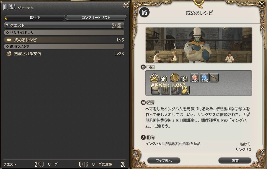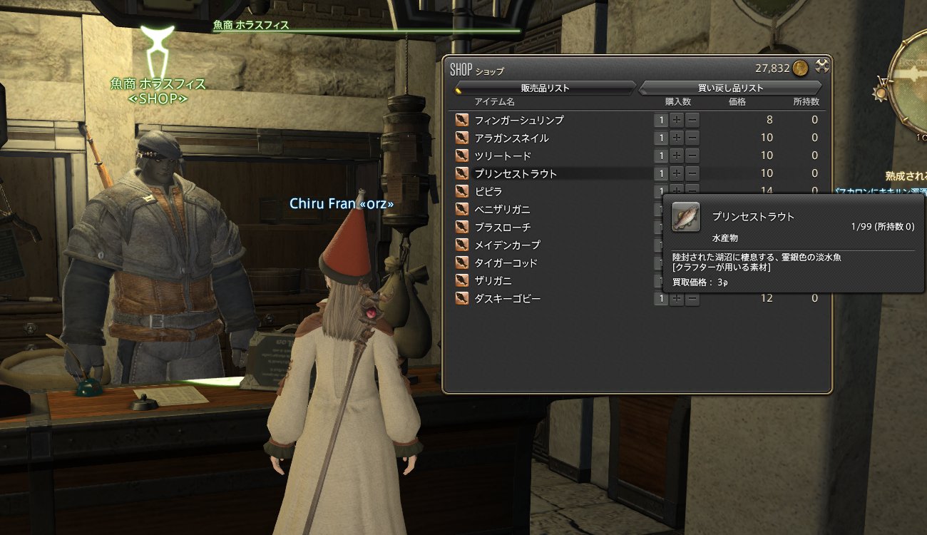 この戒めるレシピはグリルドトラウトを作って納品するクエなんですが、グリルドトラウトに必要な魚「プリンセストラウト」が調理師ギルドには売っていないのですがリムサ・ロミンサの上甲板層:魚商「ハイアライン」にあります。